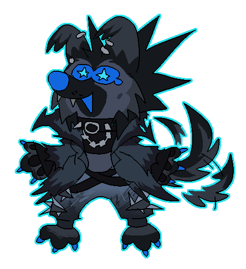 Naturally, they're a blueish black-and-gray dog. The blue accents and stylized hair & clothes are inspired by Noir Dedede, a character who I kin and personally connect with.